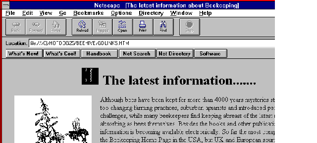 Full of jargon Web servers are machines on the Internet which ‘host’ information in a number of ways. They will allow remote access by obscure tools like ‘gopher’ or ‘veronica’. They might allow you to exchange files of data using something like ‘FTP’ or ‘Kermit’. For most of us they will display pages of text and graphics written in a common ‘style’ known as HTML or JAVA and to translate these pages for us (Web Pages) we use an interpreter known as a ‘browser’. Don’t be put off by the slang, Web pages and the associated software are both the most sophisticated and easiest to use of the Internet services. As with most things though easily done is not necessarily well done and the technical cleverness of a web page is no guarantee of its quality. I know of about 50 Web sites hosting beekeeping pages and its just not possible to discuss the merits of each one, there are rotten apples, green apples and nice shiny red apples. Predictably given the cost and visual appeal the suppliers and commercial apiarists are the forerunners, there are useful sites by government or academic institutions and even some (hang the expense ! ) by amateur beekeepers like me.