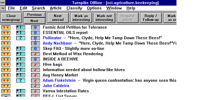 The alternative to Beenet is to pay to connect to an Internet service provider (an ISP) and use email as your mail tool. An ISP has computers that are part of the Internet and collects, stores and distributes mail messages to the other computers connected. Email is the most basic of the Internet tools and is nothing more than a electronic letter. Because you can’t afford to be permanently ‘in’ to receive your mail the ISP acts as an intermediary and your computer ‘phones them to collect it. If you know another beekeeper you can use email and correspond as usual. Where things get more interesting however is when a group of email users correspond ‘publicly’ so to speak, by posting messages for each other to read to the same computer. This then ‘displays’ them to all the members of the group. Its very much the same as posting messages on a bulletin board but is usually organised so the relationship between the messages, the ‘thread’ of the conversation, is very much clearer. These groups of people are called newsgroups and sometimes the jargon will talk about ‘usenet’ meaning the groups of people who use networked computers in this way ( user + network).